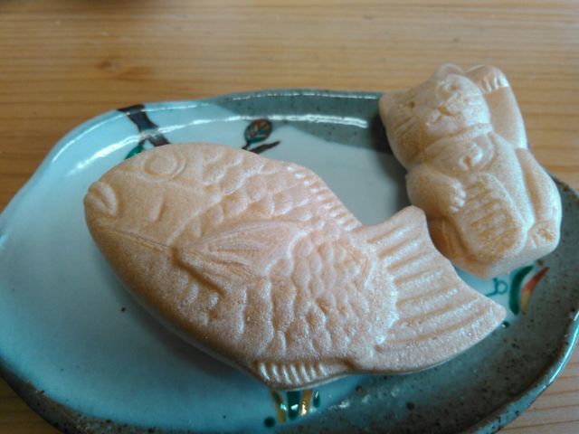 ② パカっと開けると、中には、おめでたい形の最中の皮(ひょうたん、招き猫、鯛、梅)とあんこ