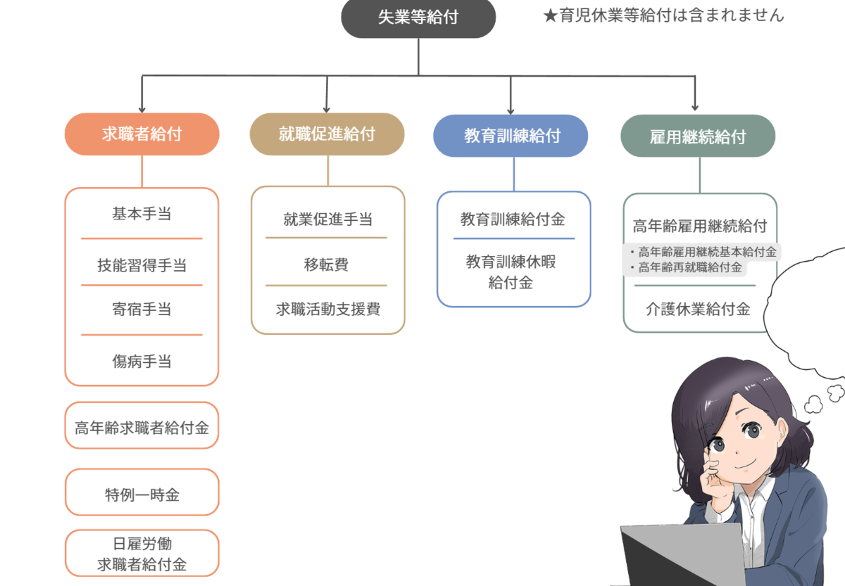 メインの失業等給付には、①求職者給付、②就職促進給付、③雇用継続給付、④教育訓練給付の4つの給付があります。