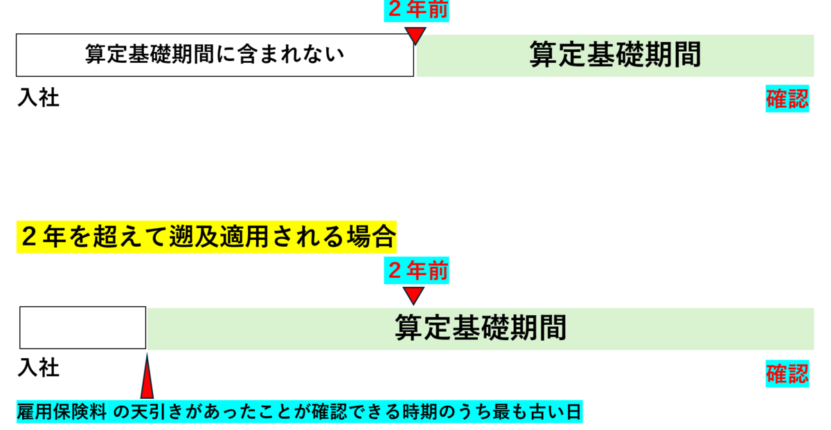 雇用保険の被保険者となった日が「被保険者となったことの確認があった日」の2年前の日より前であるときは、確認のあった日の2年前の日に当該被保険者となったものとみなされます。
