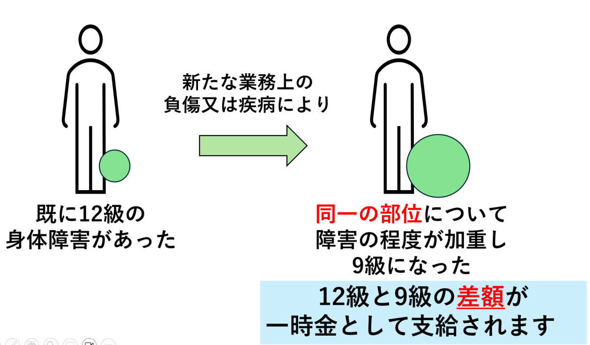 則第14条第5項 既に身体障害のあった者が、負傷又は疾病により同一の部位について障害の程度を加重した場合における当該事由に係る障害補償給付は、現在の身体障害の該当する障害等級に応ずる障害補償給付とし、その額は、現在の身体障害の該当する障害等級に応ずる障害補償給付の額から、既にあつた身体障害の該当する障害等級に応ずる障害補償給付の額を差し引いた額による。